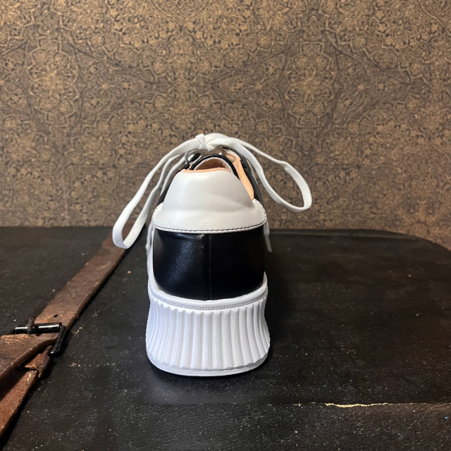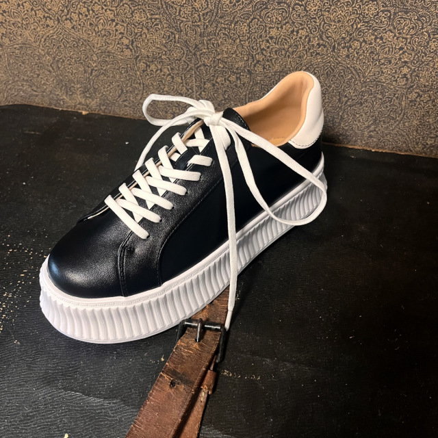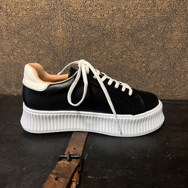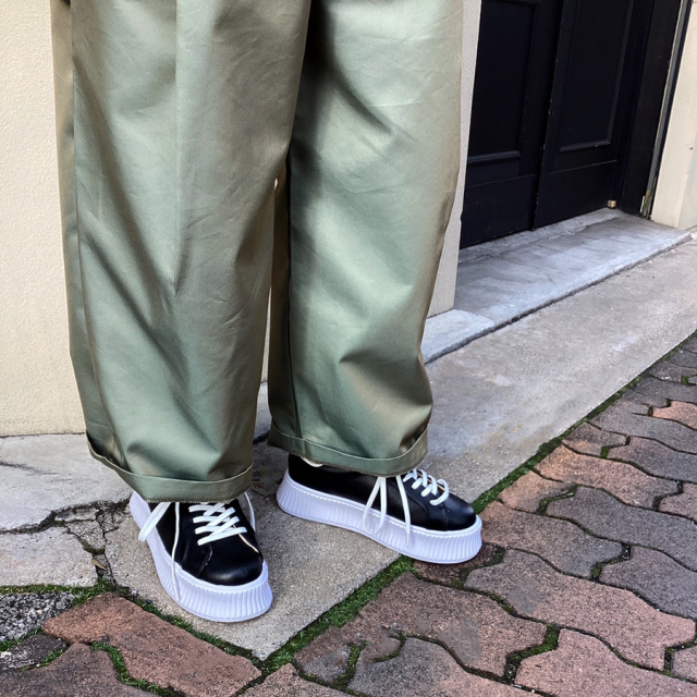 TOPシューズ 【Unpeu Femmeオリジナル】配色厚底ソールスニーカー SALE期間中: ¥12,150 (税込 ¥13,365) 販売期間: 数量: 個 サイズ在庫購入Mサイズ(23cm~23.5cm相当)△残りわずかです! Lサイズ(24cm~24.5cm相当)△残りわずかです! サイズ在庫購入Mサイズ(23cm~23.5cm相当)△残りわずかです! Lサイズ(24cm~24.5cm相当)△残りわずかです! 返品についての詳細はこちら Unpeu Femmeオリジナルの厚底ソールスニーカーを制作しました。 渋い光沢のあるブラックのフェイクレザーと厚底のホワイトソールのコントラストで少しモードで重厚感のあるスポーツスニーカーを表現。 後ろにベージュのポイント色をさして全体に少し甘さを加えてます。 カジュアルアイテムにはもちろん、キレイめアイテムにも合う万能スニーカーです。
