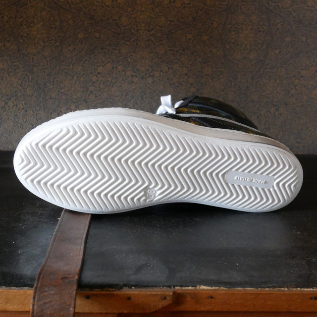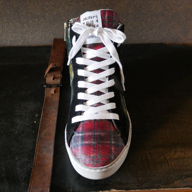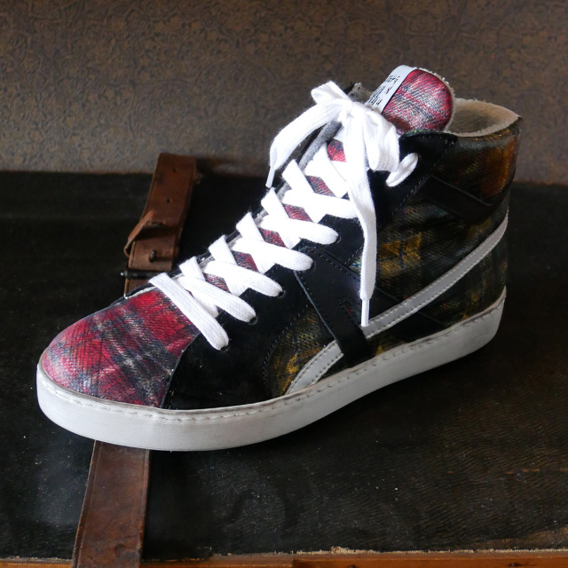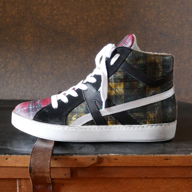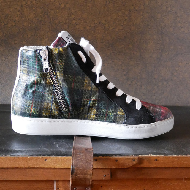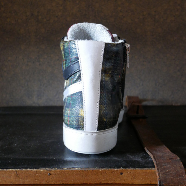 牛革にプラスチックコーティングを施したチェック柄素材を使用したハイカットスニーカー